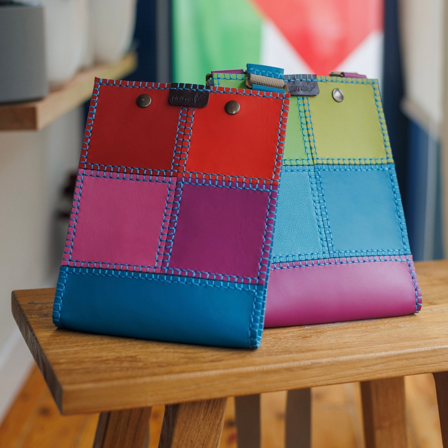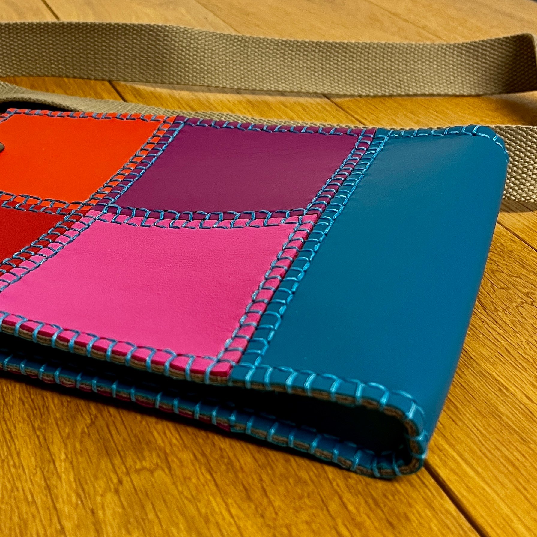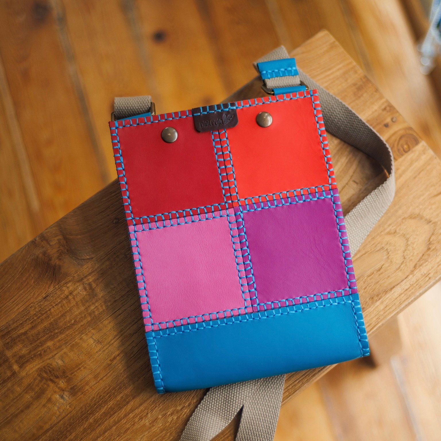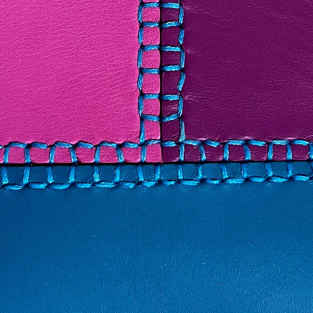 Bolso de bandolera minimalista, diferente, estiloso y exclusivo. Bajo su aparente sencillez se esconde un bolso muy laborioso, pues tiene mucho trabajo del característico cosido Pielroja. Es este cosido totalmente manual (y el alegre y original colorido) el que le da un carácter especial. Un bolso que no es para cualquiera, sólo para quien sabe apreciar el trabajo bien hecho.