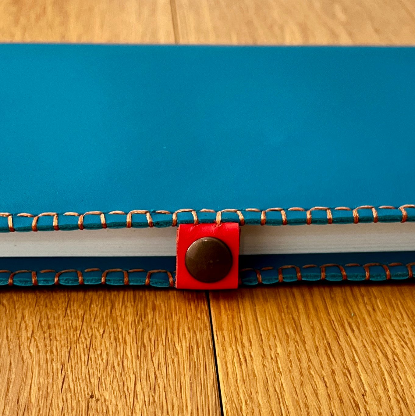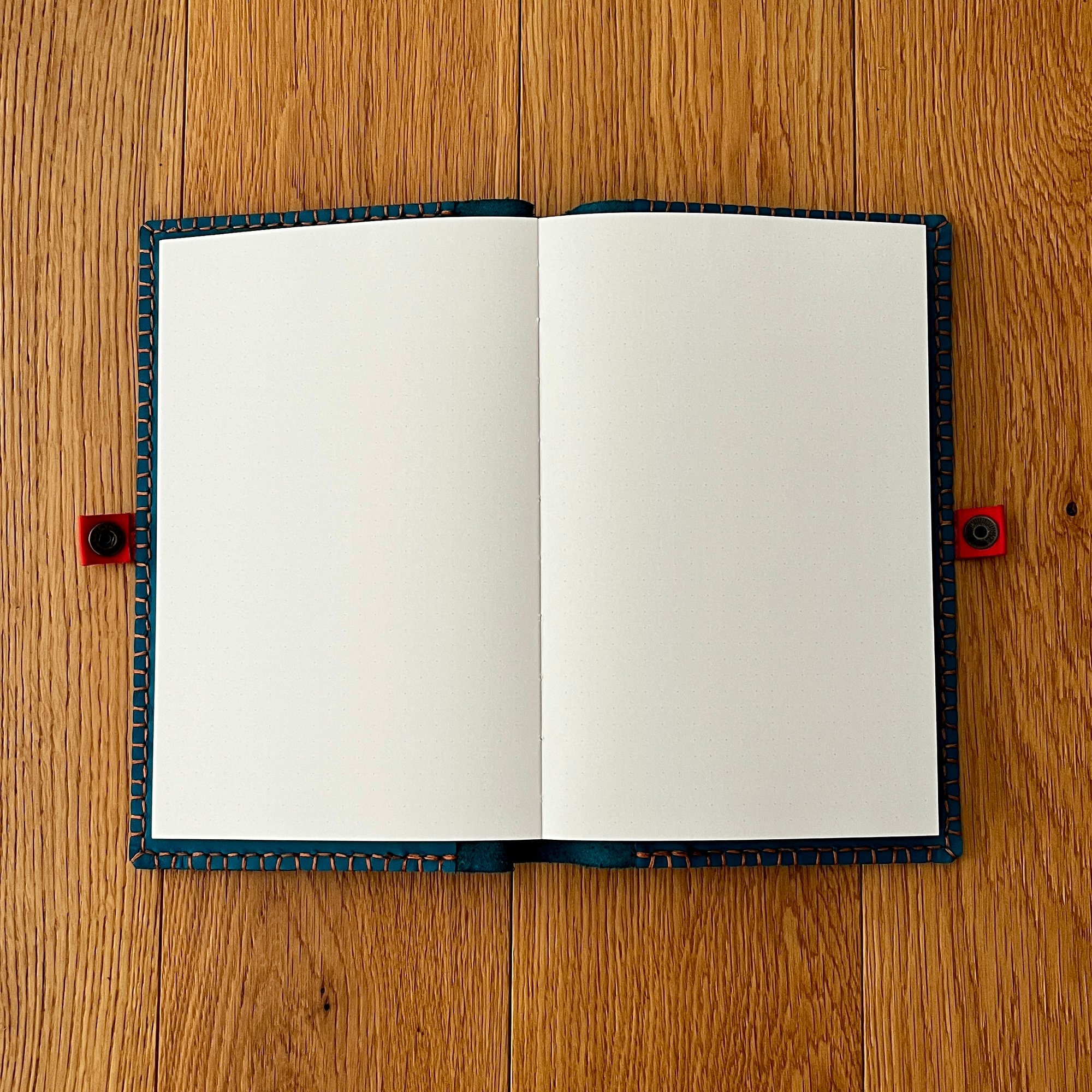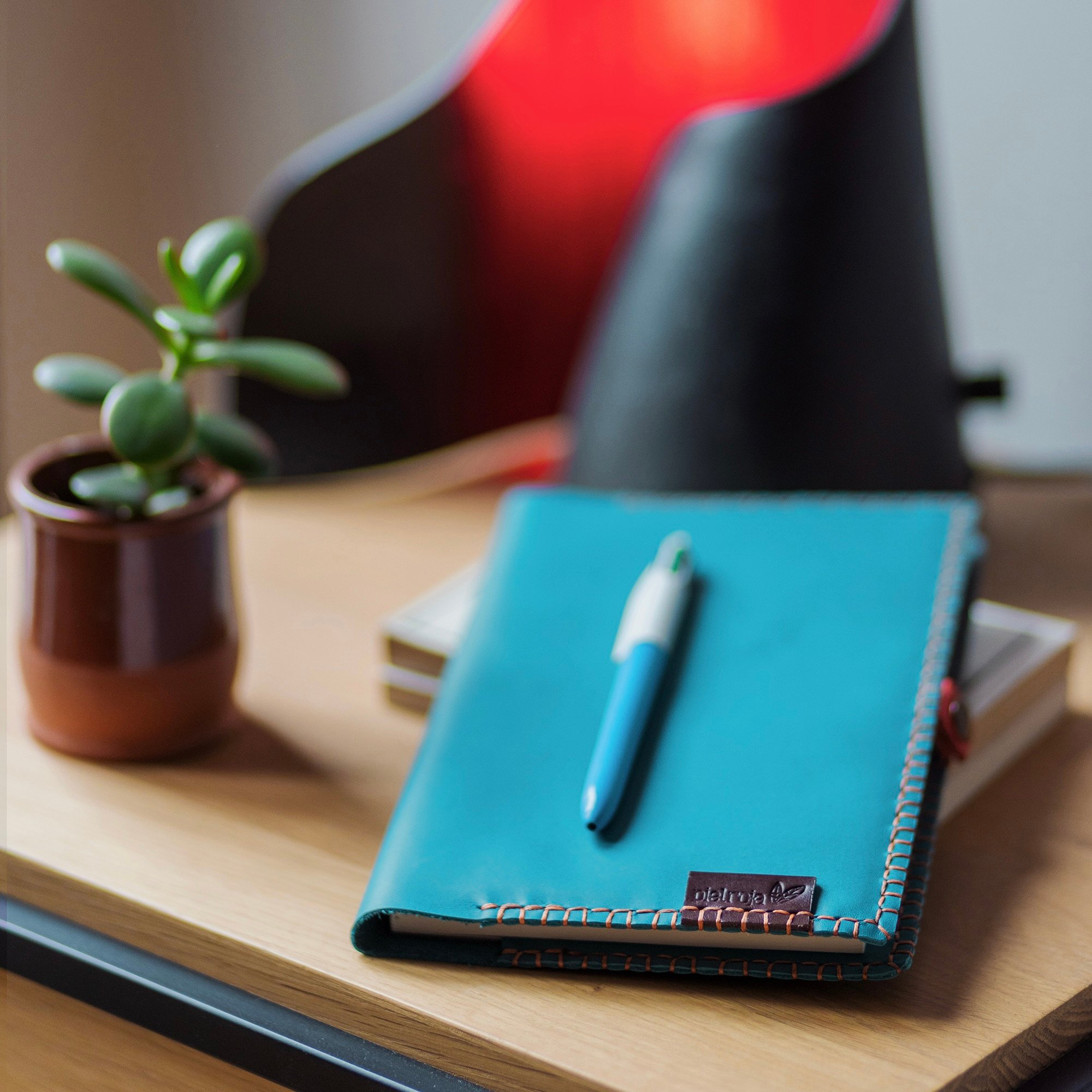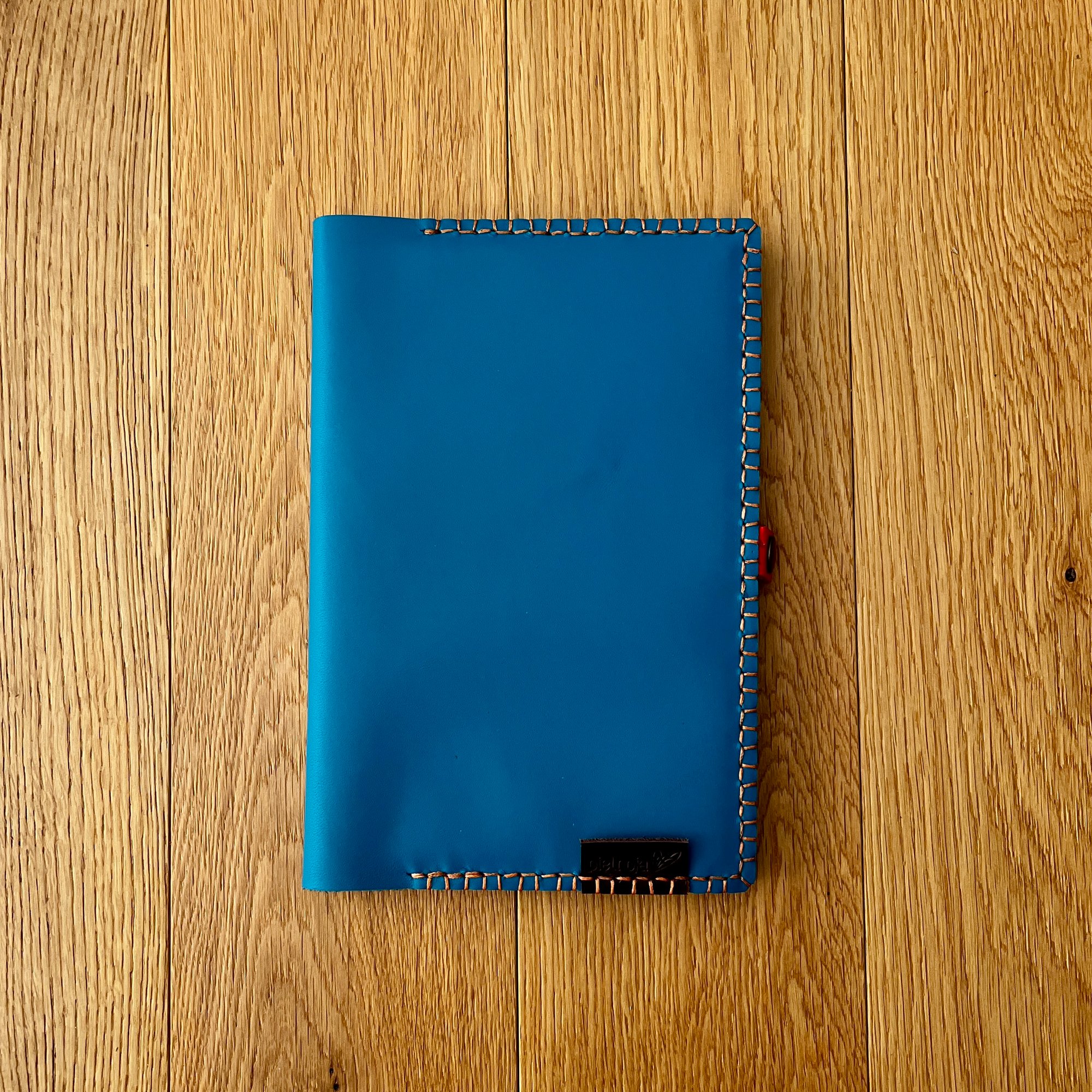 Preciosa funda de cuero azul, totalmente cosida a mano. Tiene la medida exacta para albergar y proteger un cuaderno Yuzu de la prestigiosa marca británica de papelería artesanal Pith (cuaderno de 156 páginas y 130 gr de gramaje incluido en el precio).