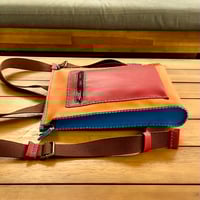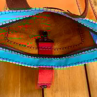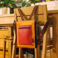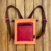 Mochila de cuero naranja, rojo y azul, de tamaño mediano (30 x 24 x 5 cm) con un diseño funcional. En la parte trasera tiene un bolsillo con cremallera muy útil para llevar el móvil a salvo y con muy fácil acceso. En la parte delantera tiene otro bolsillo con cremallera para llevar los objetos de poco valor. El espacioso compartimento central también está cerrado con cremallera y protegido de los robos por un cierre con botón a presión, que queda escondido entre la espalda y la mochila. Además en el interior tiene un práctico mosquetón para llevar el llavero o colgar cualquier cosa que sea necesaria. La mochila está hecha con piel de vacuno y componentes de alta calidad (cremalleras YKK, botones a presión Prym...).